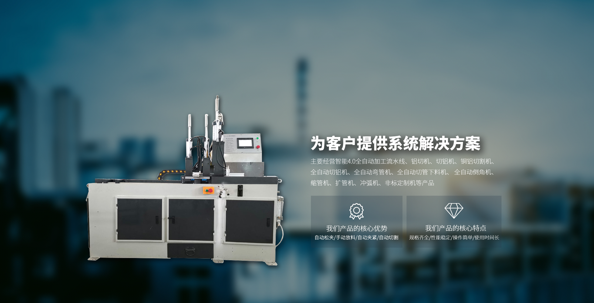 主要經(jīng)營智能4.0全自動加工流水線、鋁切機、切鋁機、銅鋁切割機、全自動切鋁機、全自動彎管機、全自動切管下料機、 全自動倒角機、縮管機、擴管機、沖弧機、非標(biāo)定制機等產(chǎn)品